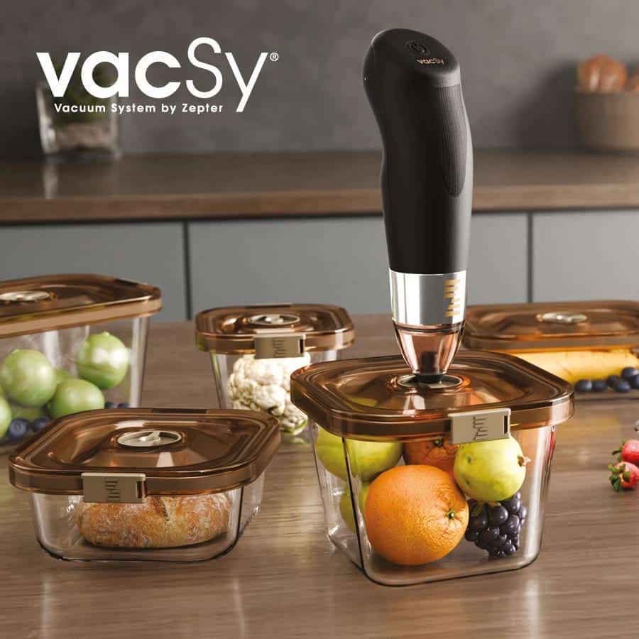 VacSy® je patentovaný vákuový systém navrhnutý tak, aby umožnil vytvorenie potravinárskeho vákua vnútri špeciálnych nádob zo skla a lexanu. Vákuum ničí baktérie a všetky druhy plesní, ktoré na prežitie a množenie potrebujú kyslík. Zároveň si jedlo zachová cenné nutričné vlastnosti!